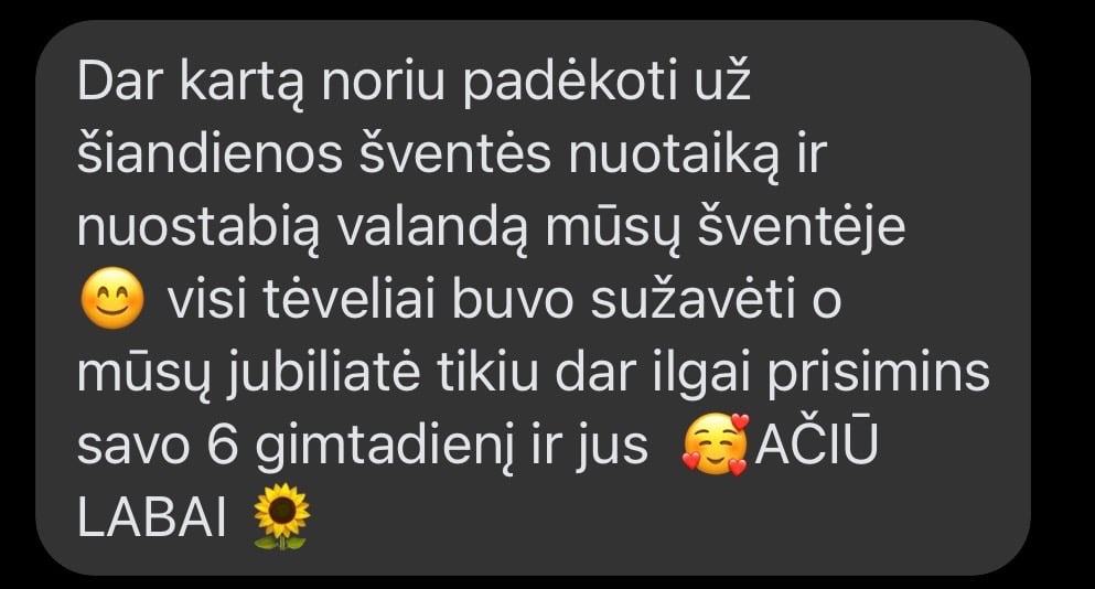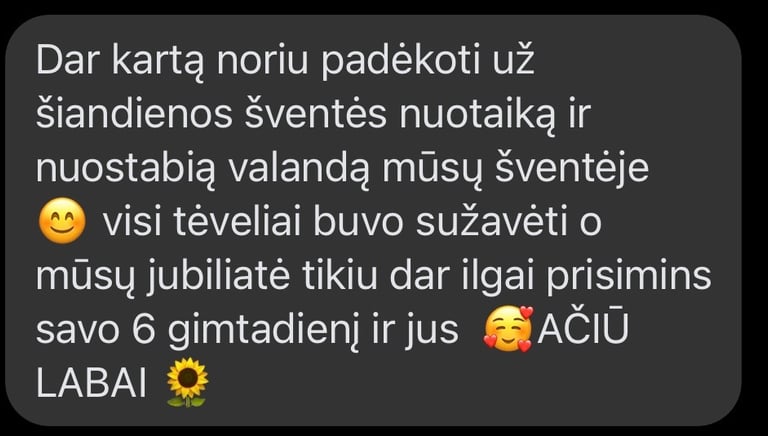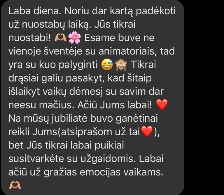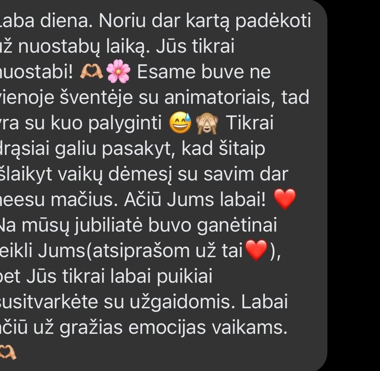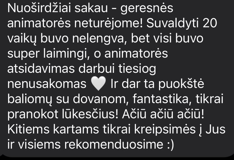 Labai, labai rekomenduoju šią nuostabią animatorę! Ačiū už nepaprastai gražią šventę – vaikai buvo laimingi, užsiėmę ir kupini įspūdžių. Viskas buvo taip šilta, linksma ir nuoširdu, kad šventė tikrai tapo ypatinga.